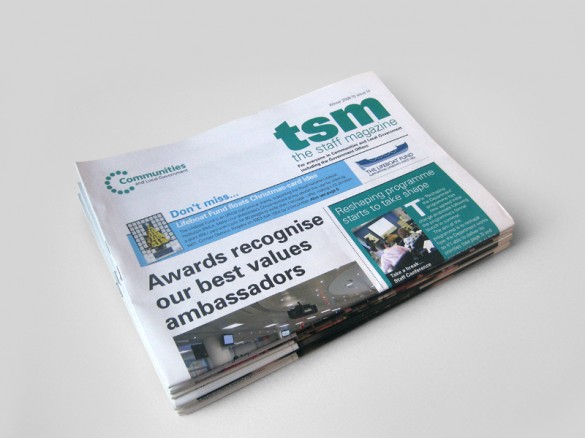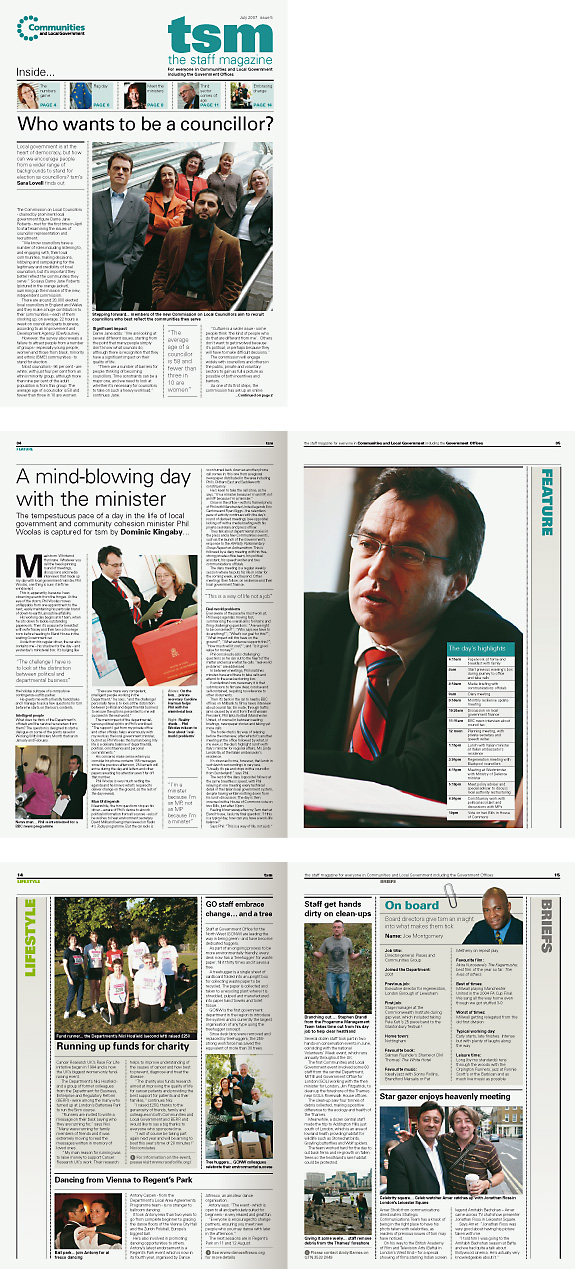 tsm was an award-winning staff magazine for DCLG – it came out every other month, providing a heady mix of departmental news, staff interviews, columns and so on. Lindsay restyled the publication, to give it a fresh, appealing look and feel, and then designed each issue for the next two years. Catherine provided occasional editorial support. She made one visit to their rather stunning offices in Victoria, but unfortunately got lost on the way out, and had to be escorted from the building.